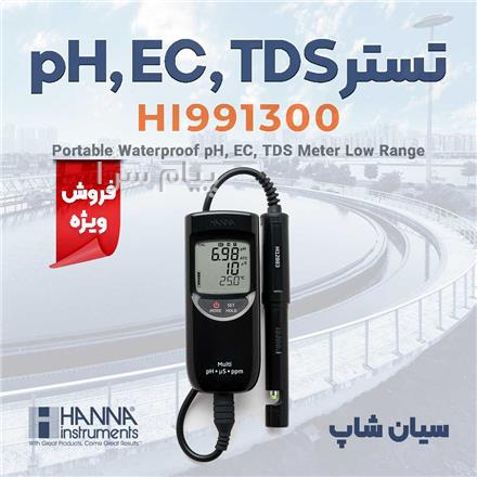 تستر PH, هدایت و سختی مایعات هانا HANNA HI991300 یک متر قابل حمل باریک، سبک و ضد آب است که pH، رسانایی (EC)، کل جامدات محلول (TDS) و دما را با یک پروب تقویت شده اندازه گیری می کند. عملیات متر با دو دکمه ساده شده است. یکی برای روشن/خاموش کردن و برای کالیبراسیون و دیگری برای جابجایی بین حالتهای اندازهگیری استفاده میشود. HI991300 دارای ویژگی های پیشرفته ای از جمله ضریب تبدیل EC به TDS قابل انتخاب است (0.45 - 450 ppm و 1.0 - 1000 ppm).
